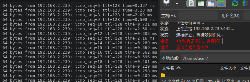端口用的就445提示连接建立,但提示10 秒后无活动,连接超时