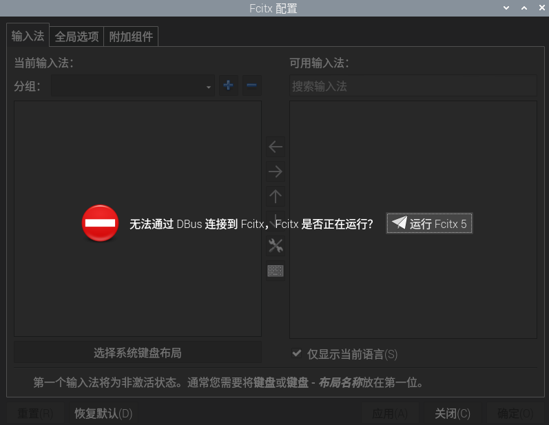 我现在暂时的方法是一直保持一个terminal中运行fcitx5,否则无法输入中文。