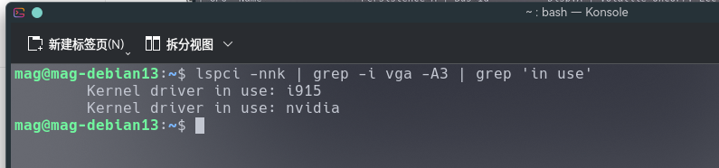 lspci -nnk | grep -i vga -A3 | grep ‘in use’