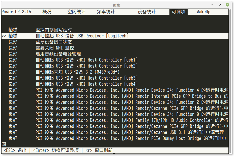 - 如果这一项是 “良好”,那么代表系统开启了 “自动挂起 USB 设备” 功能,可能会关掉一些 USB 接口,以节约用电。我之前试过,开启这个选项后会导致鼠标断开连接。