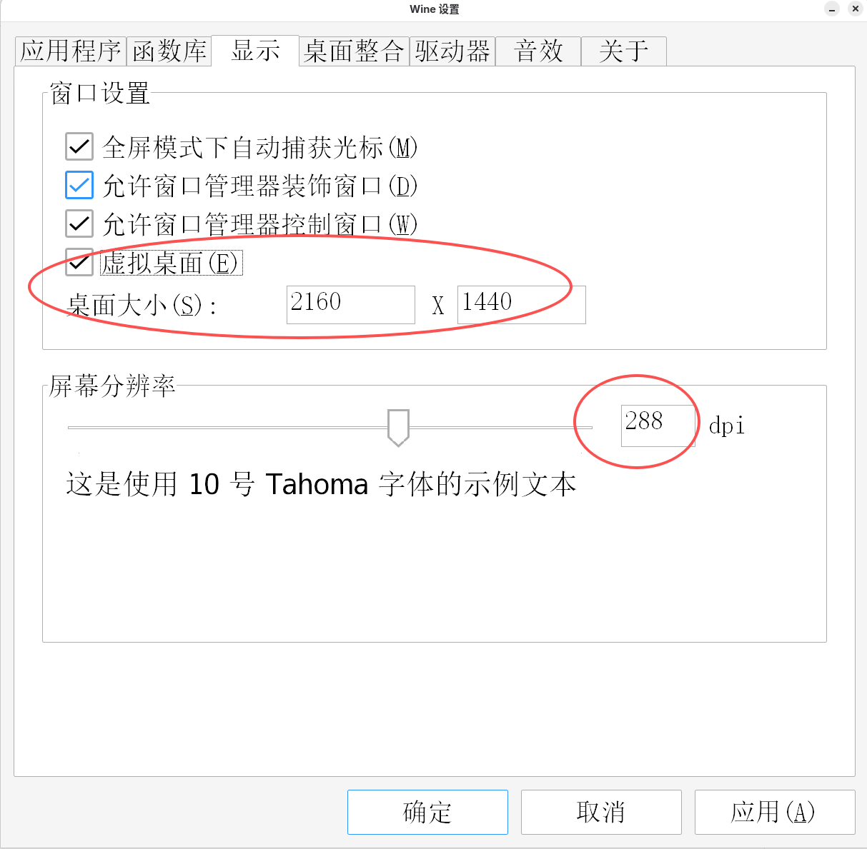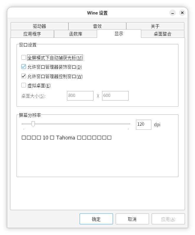 这个是设置 Wine 虚拟桌面的分辨率,在 winecfg 的 “桌面整合” 选项卡里。