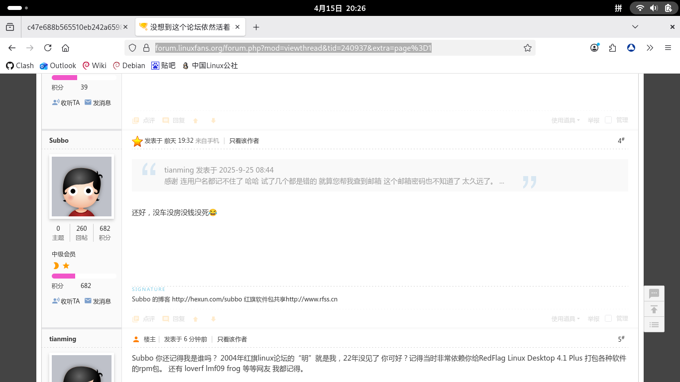 @ Subbo 如果你在Debian中文论坛看到了 请速速回复 22年没见 你可好?
