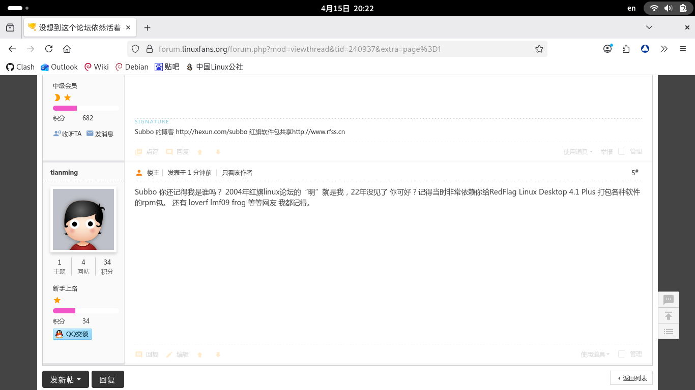 真是弹指一挥间啊,22年了。2004年第一次接触Linux给我最大帮助的网友就是Subbo 没想到他出现了。